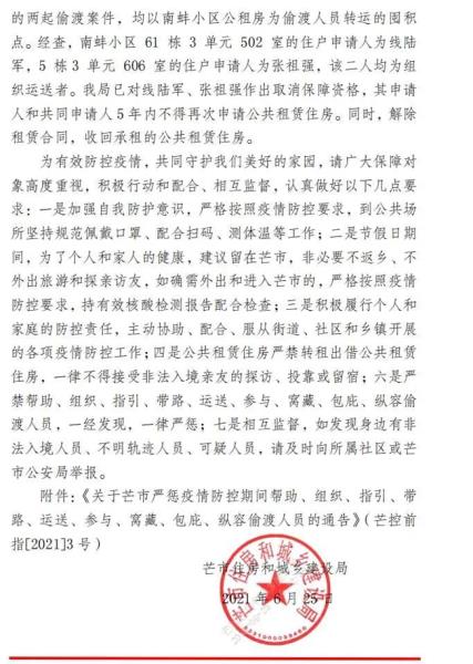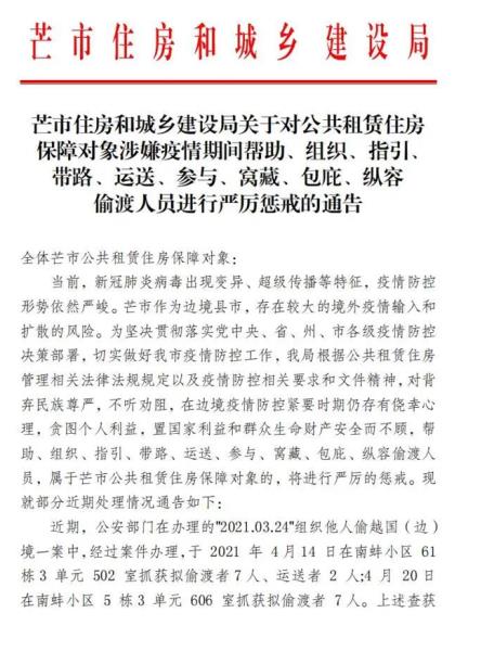 芒市住房和城乡建设局关于对公共租赁住房保障对象涉嫌疫情期间帮助、组织、指引、带路、运送、参与、窝藏、包庇、纵容偷渡人员进行严厉惩戒的通知