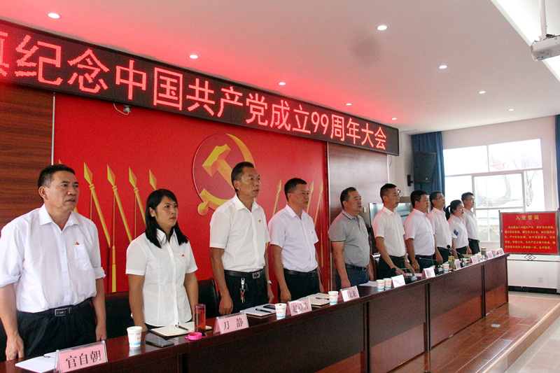 为庆祝中国共产党成立99周年,进一步增强全镇各级党组织凝聚力和战斗力,激发广大党员干部以饱满昂扬的精神助推勐戛镇各项事业跨越式发展。2020年7月1日上午,勐戛镇组织召开庆祝中国共产党成立99周年大会,市委常委、常务副市长杨绍刚、镇党政领导班子成员、各村党总支书记、副书记、驻村第一书记、老干支部书记、党政支部、青年人才党支部、卫生院党支部等全体党员共80余人参会。会议由镇党委书记李东主持。