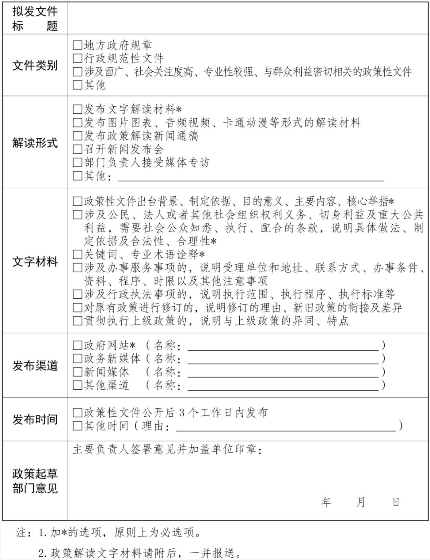 政策性文件起草时,应当加强调查研究、坚持实事求是,规范做好合法性审核、风险评估,统筹考虑政策措施的公开属性、社会关注度、可操作性等问题,避免空话套话,确保政策出台后可公开、易解读、能落地。