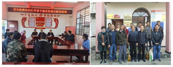 2021年2月9日上午,芒市政府办组织班子成员及挂钩帮扶干部深入挂钩点遮放镇街道村开展春节走访慰问送温暖活动,为29户建档立卡贫困户,部分困难党员、低保户、残疾人及困难群众等10户送去大米、食用油等慰问物品,为战斗在一线的驻村扶贫工作队、村“两委”干部送去了浓浓的关怀和诚挚的问候,提前向大家送上了新春的祝福。