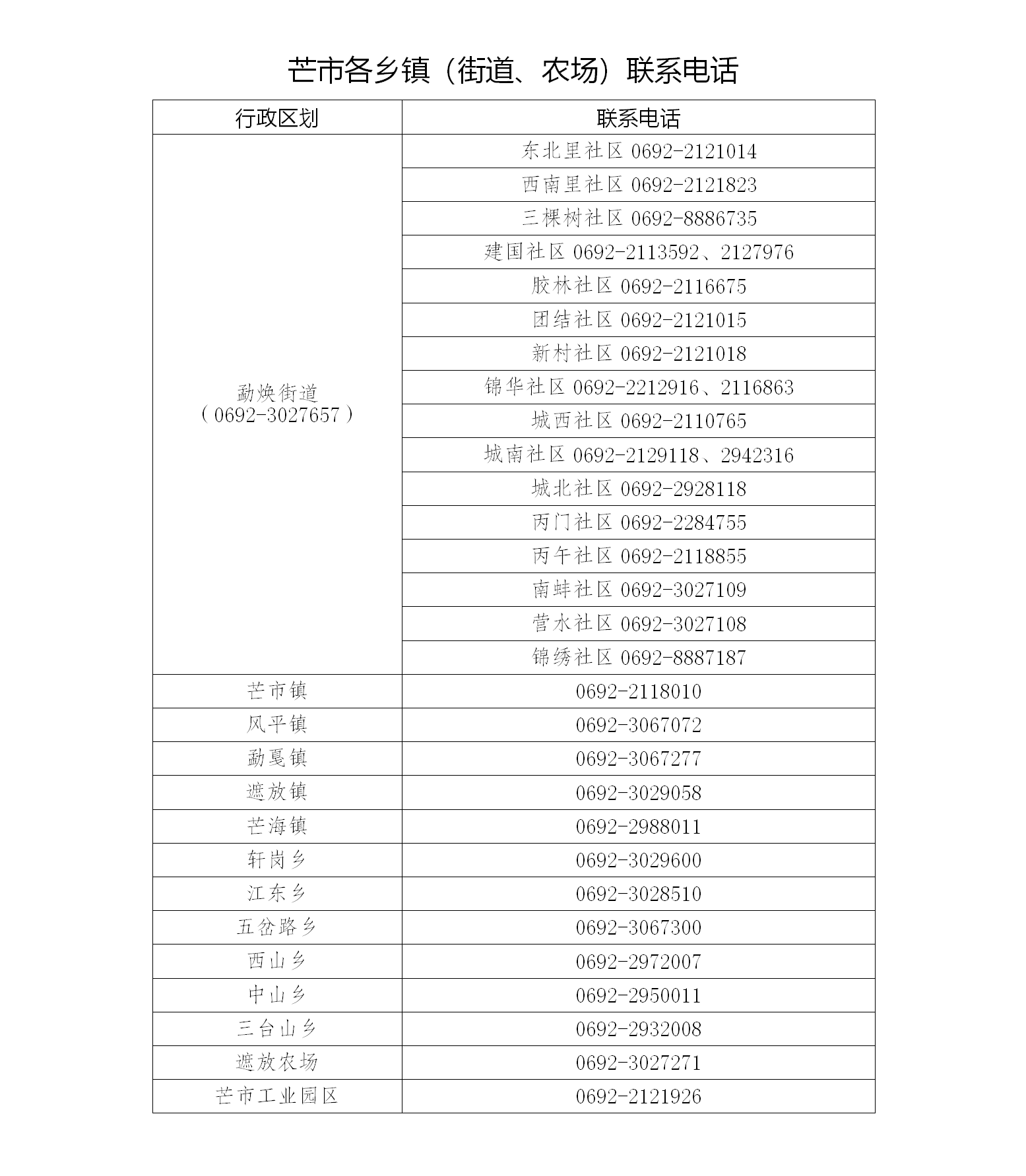 1.芒市各乡镇(街道、农场)联系电话