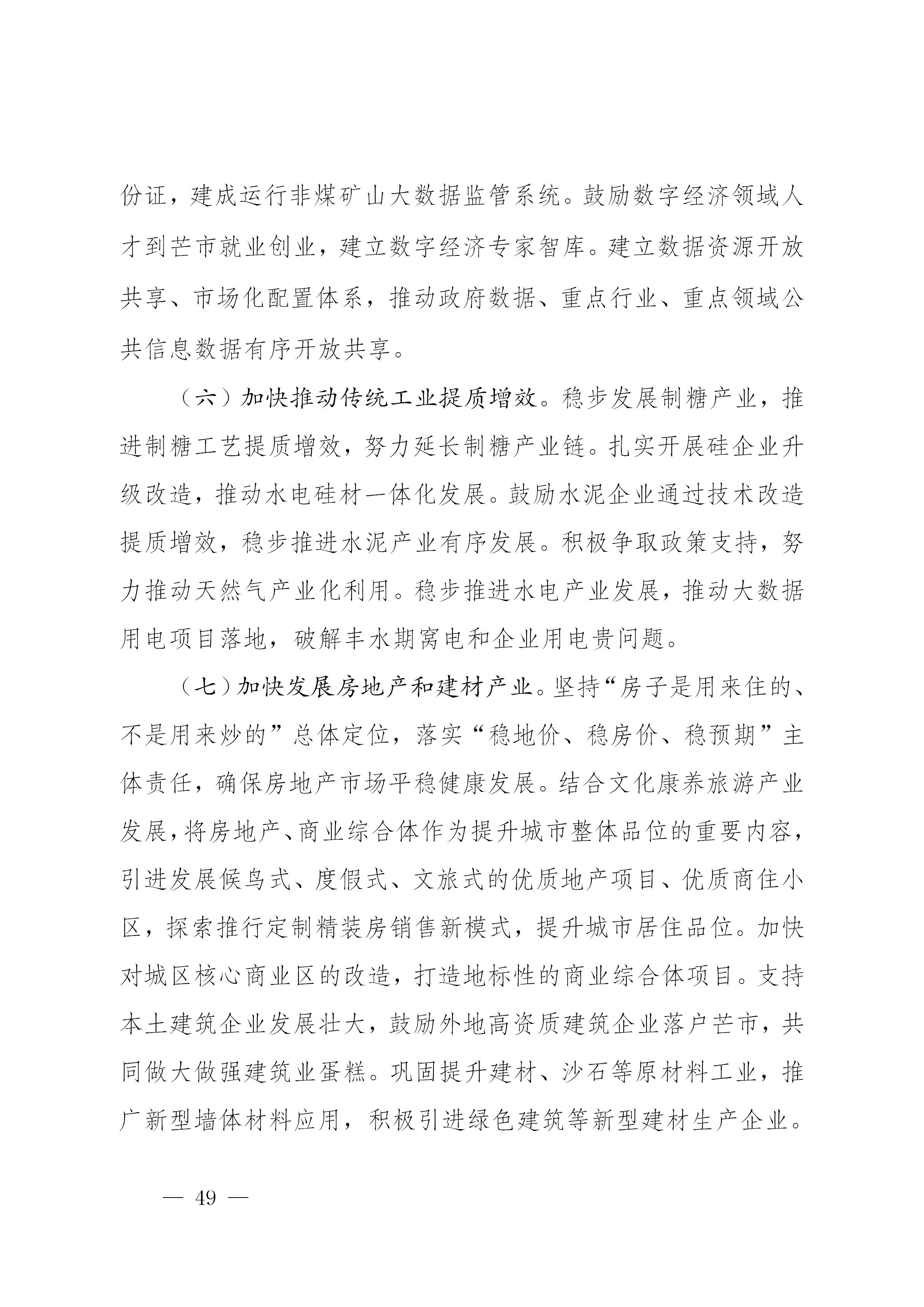 一是着力推进供给侧结构性改革再深化。着力推进以“巩固、增强、提升、畅通”为主要内容的供给侧结构性改革再深化,推进产能过剩行业和加快市场出清,加大基础设施、产业发展、社会民生等补短板力度。坚持需求引导,供给创新,积极扩大总需求,进一步结构性去产能、系统性优产能,更多应用要素价格市场化手段破除低效无效供给。持续推进执行降成本政策。按市场化方式落实水电硅材用电价格,做实农产品加工用电优惠政策,探索建立弃水电量消纳长效机制。进一步清理规范各类收费行为。健全价格政策体系,完善产业发展差别电价政策,落实超定额用水加价制度等惩罚性价格政策,加快形成推进项目建设的市场价格环境。推行居民生活用水、用电、用气阶梯价格制度。二是深化农业供给侧结构性改革。坚持科技兴农、绿色兴农、质量兴农、品牌兴农,大力提高农业创新力、竞争力和全要素生产力。进一步完善农业经营体系,优化农业支持政策,培育壮大新型农业经营主体,加快农业产业结构调整,增加农产品有效供给。扎实推进“一乡一业”“一村一品”创建,巩固提升国家现代农业示范园建设。引导和支持发展优质粮油、咖啡坚果深加工、有机茶叶、蔬菜水果小包装、肉牛生猪规模化养殖和集中屠宰深加工。大力发展农产品加工业,引导撬动各类社会资本投向农村,完善农业农村优先发展和城乡融合发展体制机制,推动乡村振兴和农村一二三产业融合发展。