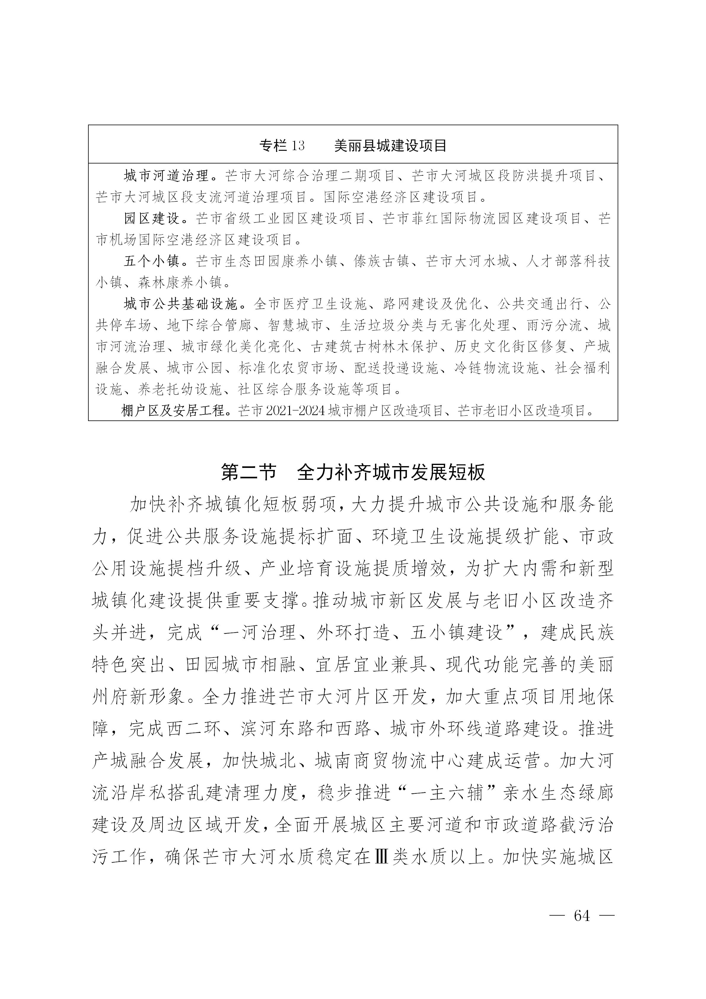 坚持以生态田园城市发展总体规划为引领,统筹推进旧城功能完善和新区开发建设,深入实施《芒市生态田园城市设计及空间发展战略规划》和《芒市大河片区控制性详细规划深度城市设计》,按照“一河三园五小镇”的建设思路,加快推进州府芒市中心城市建设。“一河”即芒市大河滨河新区,“三园”即芒市省级产业园、国际物流园、空港经济园,“五小镇”即芒市生态田园康养小镇、傣族古镇、芒市大河水城、人才部落科技小镇、森林康养小镇。突出生态田园、文旅康养、民族特色、现代气息,着力构建产业特而强、功能聚而合、形态小而美、机制新而活的产城融合发展新格局,全面提升州府芒市的综合服务功能,全力打造生态田园城市、国际花园城市和美丽县城。围绕公共服务设施提标扩面,优化医疗卫生设施、教育设施、养老托育设施、文旅体育设施、社会福利设施和社区综合服务设施。围绕环境卫生设施提级扩能,完善垃圾无害化资源化处理设施、污水集中处理设施和公共厕所。围绕市政公用设施提档升级,推进市政交通设施、市政管网设施、配送投递设施、老旧小区更新改造和城区智慧化改造。围绕产业培育设施提质增效,完善产业平台配套设施、冷链物流设施和农贸市场。优先支持公共卫生防控救治设施、医疗废物集中处置设施建设。加大古建筑、历史文化街区、历史文化遗存、古树名木等保护修护,留住城市历史记忆。适应农民进城需要,积极实施城中村改造,统筹推进城市周边村寨公共服务设施连通。坚定不移实施城乡人居环境整治,积极创建国家文明城市、国家生态城市、国家森林城市,巩固提升国家卫生城市、国家园林城市。坚持地上地下一体推进城区、园区、景区融合发展,确保新城新区新面貌。坚持优选项目、精准补短板、不留后遗症,严防“大水漫灌”,严防“半拉子工程”,严防“大拆大建”,严防“贪大求洋”。加强城市精细化管理,开展城市管理地方立法,强化城乡建设规划一茬接着一茬干、一张蓝图干到底,全面提高城市建设和治理能力现代化水平。