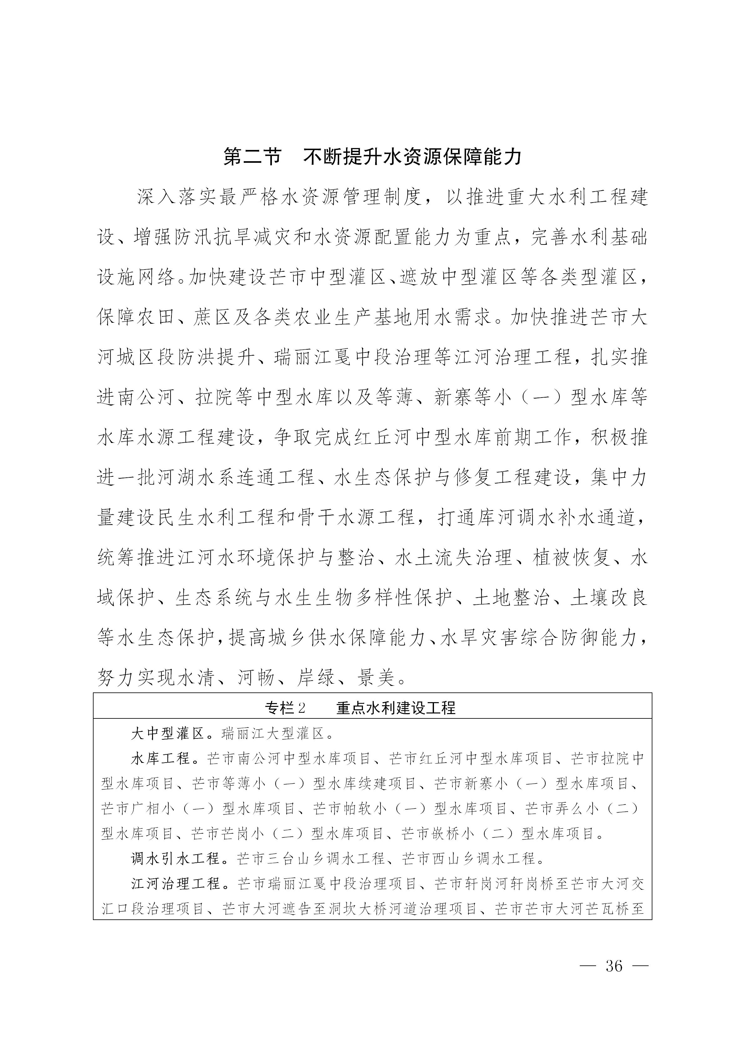 以龙江流域生态走廊、怒江流域生态走廊为“两廊”,坚持“绿水青山就是金山银山”理念,坚持“共抓大保护、不搞大开发”原则,加强龙江流域和怒江流域生物多样性保护,推进瑞丽江-大盈江风景名胜区保护性开发利用,加大公益林、天然林管护力度,加强饮用水源地保护,严守“生态保护红线、永久基本农田、城市开发边界”三条控制线,实施芒市大河综合治理和生态脆弱地修复工程,强化重点保护野生动物栖息地保护,坚决守护好芒市的绿水青山,筑牢西南生态安全屏障。