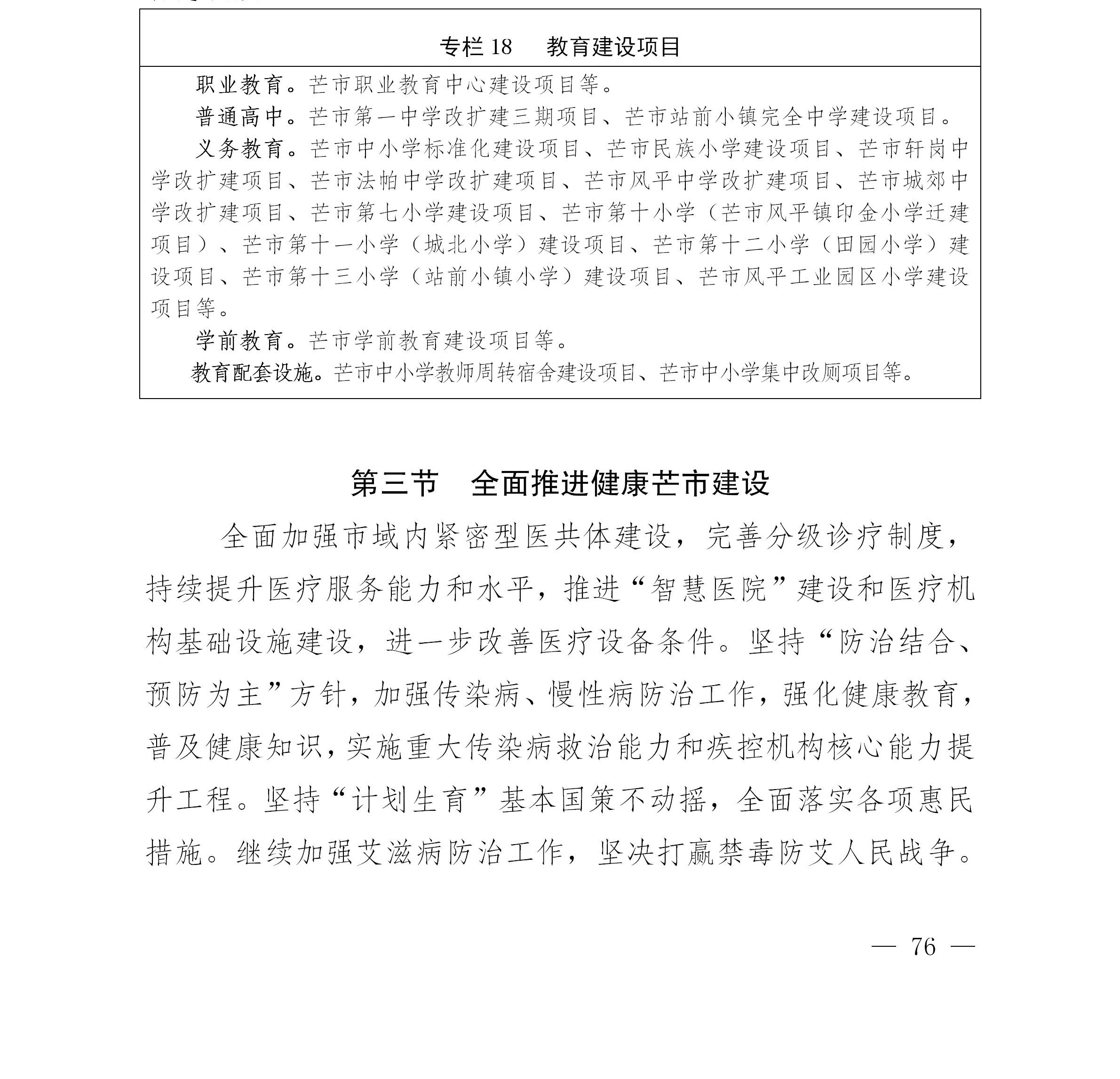 着力补齐芒市农村学前教育短板,实施一村一幼建设项目,做好幼儿园对口帮扶工作,合理配置学前教育资源,做好城镇幼儿园按需规划布局工作。推动城乡义务教育一体化发展,加快改善薄弱学校基本办学条件,全面加强乡村小规模学校、乡镇寄宿制学校建设。增加芒市义务教育学校学位供给,盘活城郊结合部中小学教育资源,有效解决“大班额”“择校热”问题,做好控辍保学工作。加大普通高中建设力度,努力提升高中阶段毛入学率,逐步普及高中阶段教育。围绕芒市产业布局和发展需要,发展现代职业教育,推进职业教育东西部协作,促进产教融合、校企合作。把特殊教育纳入普及义务教育的轨道,提升残疾儿童少年受教育水平。积极探索新时代老年教育发展新模式,努力办好芒市老年大学。加强师德师风建设,重视教师培训,培养高素质教师队伍。健全教育国际交流与合作的工作机制。推进智慧教育普惠提质。