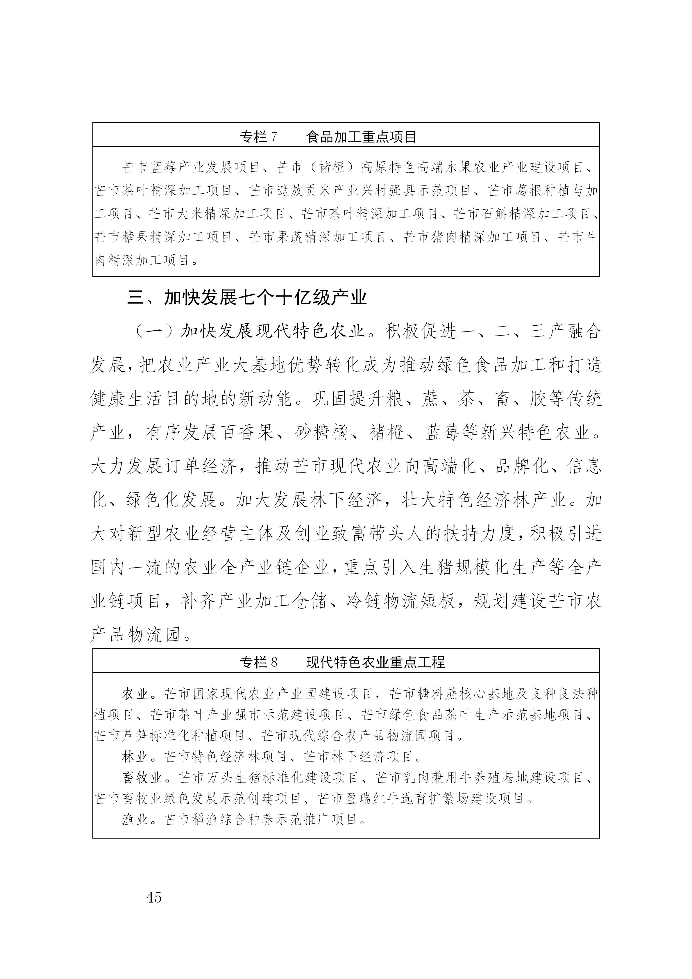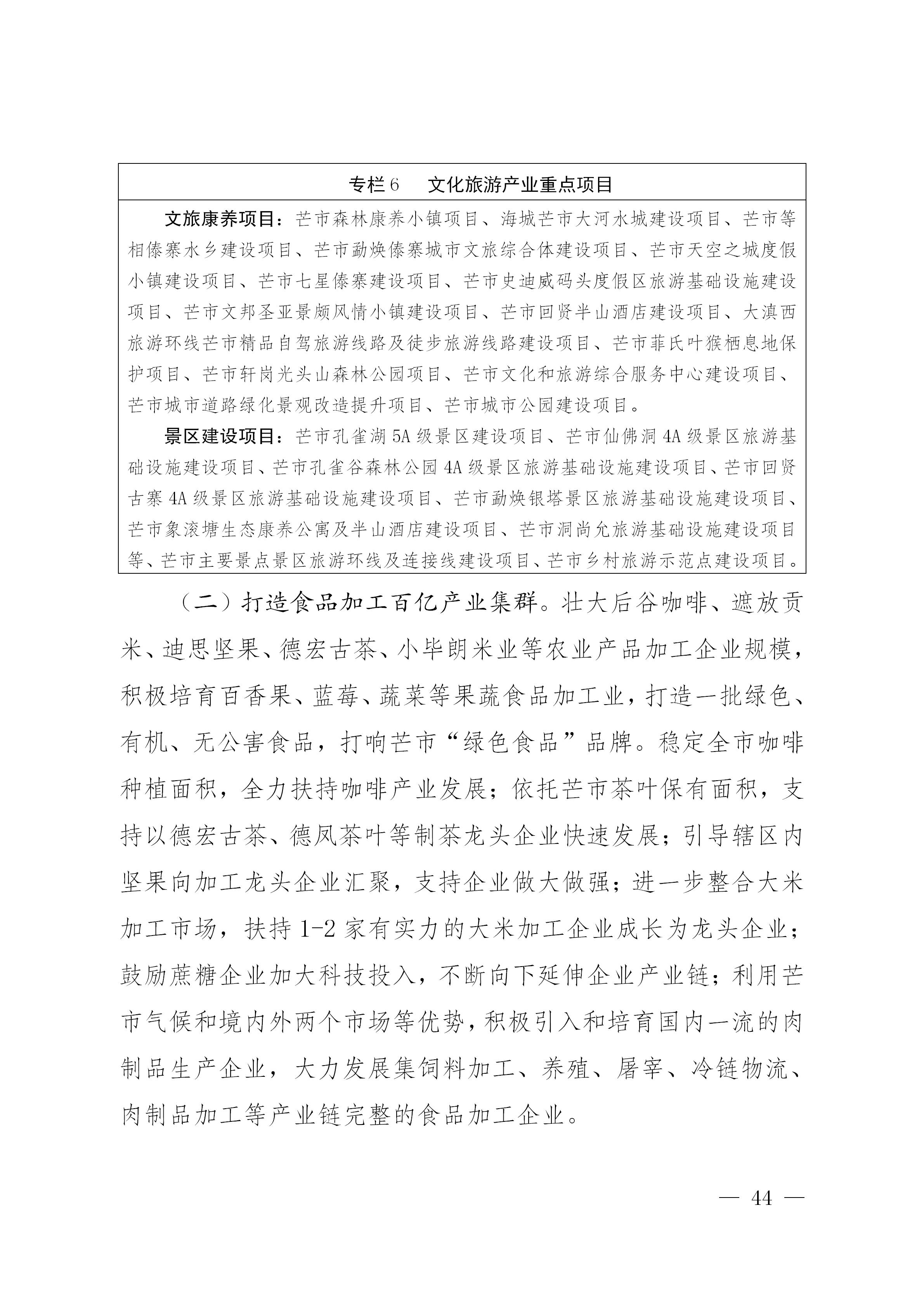 按照“大产业+新主体+新平台”发展思路,加快“一乡一业、一村一品”培育,抓住种子端、电商端,推广设施化、有机化、数字化,促进农业业态全面升级。大力发展高原特色农业,做大做强做优绿色食品产业。持续增强绿色食品原料生产能力,促进咖啡、坚果、茶叶、水稻、甘蔗、蓝莓、砂糖橘、百香果、马铃薯、甜玉米、高山蔬菜、生猪、肉牛等优势特色产业向全产业链发展。鼓励通过发展优质高效的设施农业,提高原材料保障水平。全市粮食播种面积稳定在55万亩以上,甘蔗面积稳定在12万亩以上,确保冬季农业35万亩、茶园面积13.5万亩、烟叶面积5万亩、咖啡面积5万亩、坚果面积18万亩、水果面积15万亩、蔬菜面积22万亩、中药材面积3.5万亩以上。建设规模化肉牛养殖场5个、养猪场10个。积极开展跨境现代农业合作,不断壮大绿色食品境外原料基地,重点发展甘蔗、水果、蚕桑、肉牛、水产、粮食、冬早蔬菜等种养殖业。依托芒市省级食品产业园,以延伸产业链、价值链为重点,大力发展绿色食品加工业。鼓励开发培育营养食品、功能性食品、食品添加剂产业,加快发展食品保鲜、安全检测、节能环保等先进技术和工艺。加强食品质量安全保障,健全特色农产品质量标准体系,全面实施化肥农药减量化行动,大力发展绿色有机生产基地。建立绿色食品交易中心,加快建设冷链物流配套设施,完善农超对接、城乡对接绿色食品物流配送体系。加快创建“三品一标”产品,强化农产品地理标志和商标建设,积极打造区域品牌、企业品牌、产品品牌,依托“一部手机云品荟”等品牌,强化绿色食品品牌营销。
