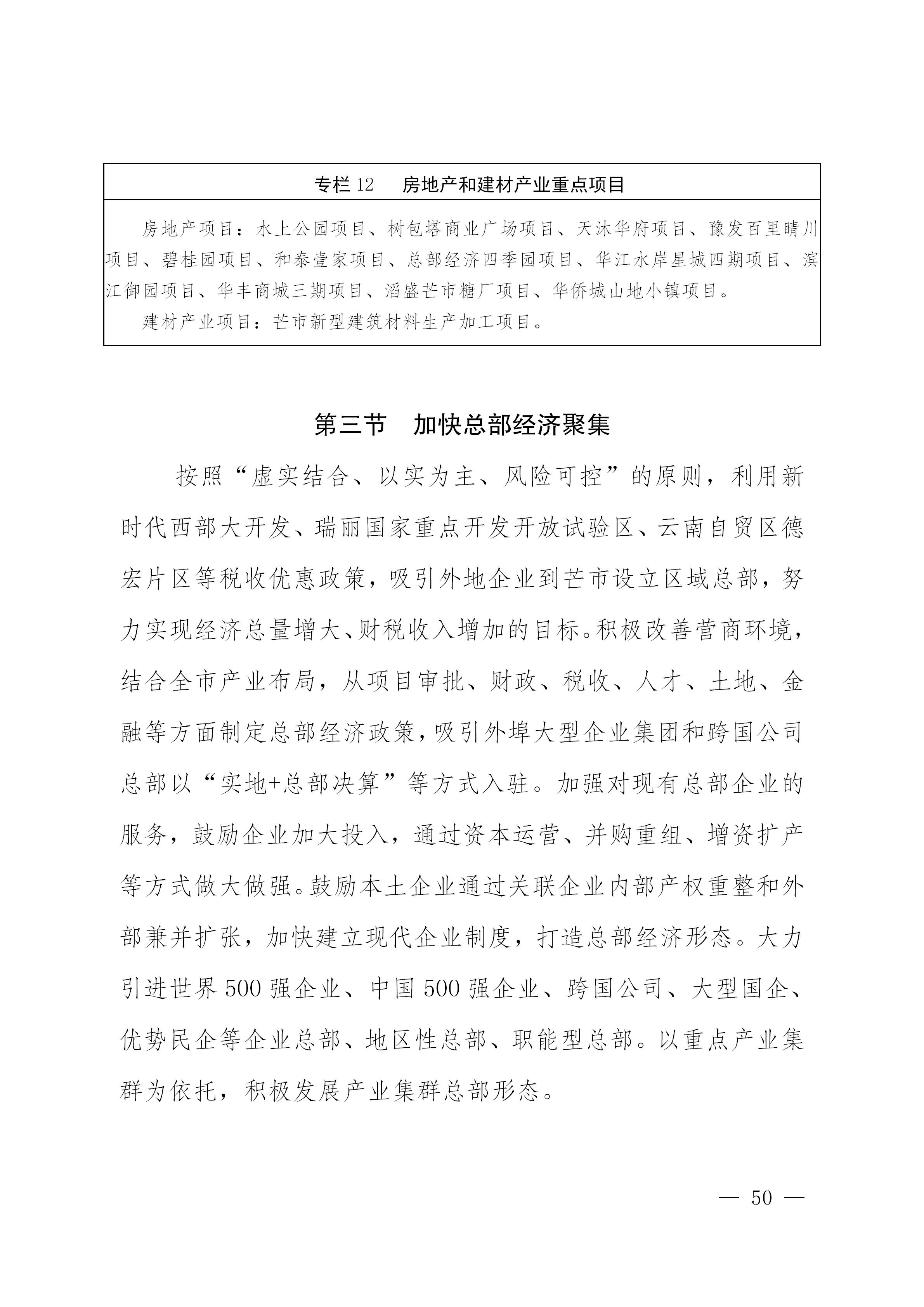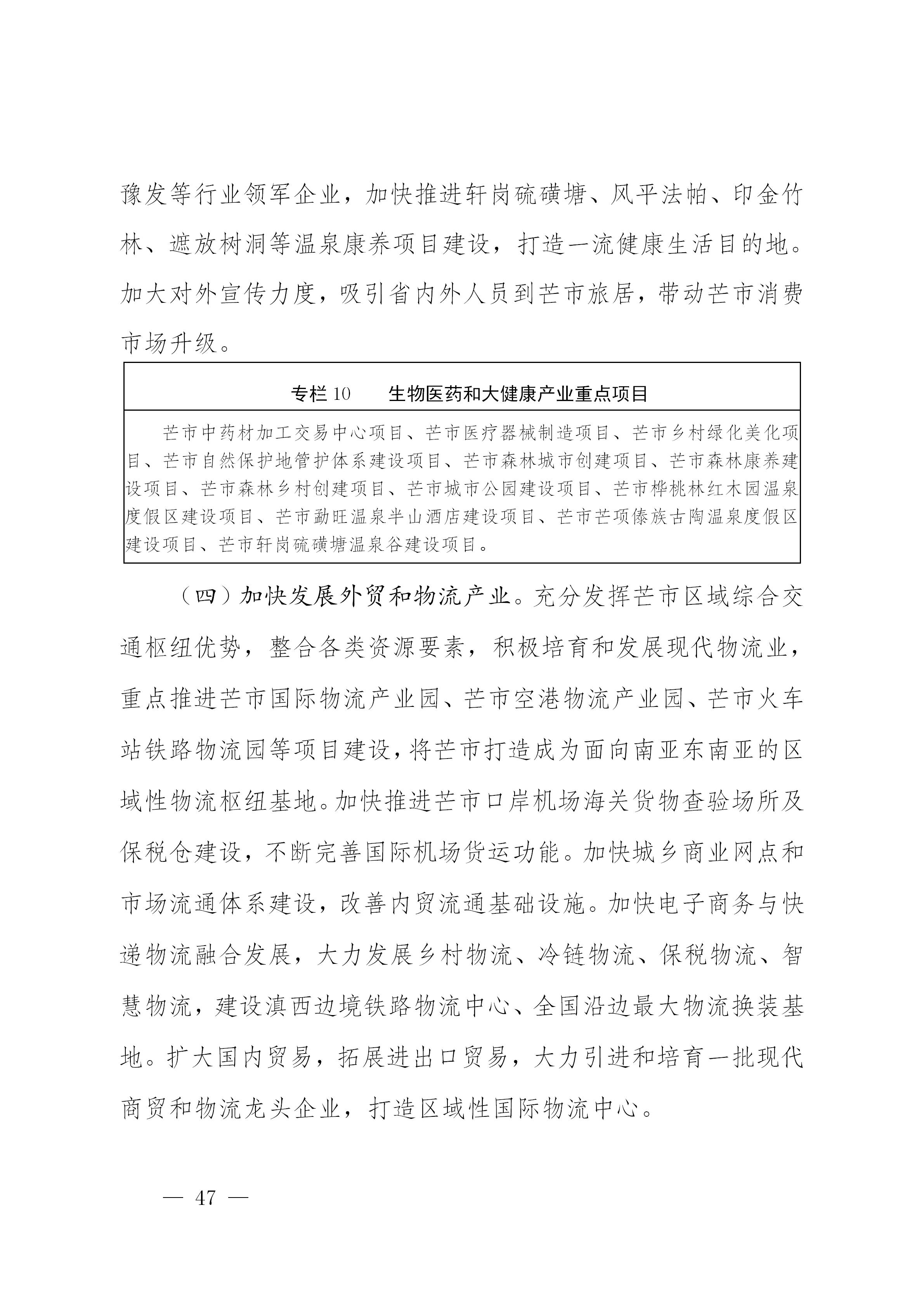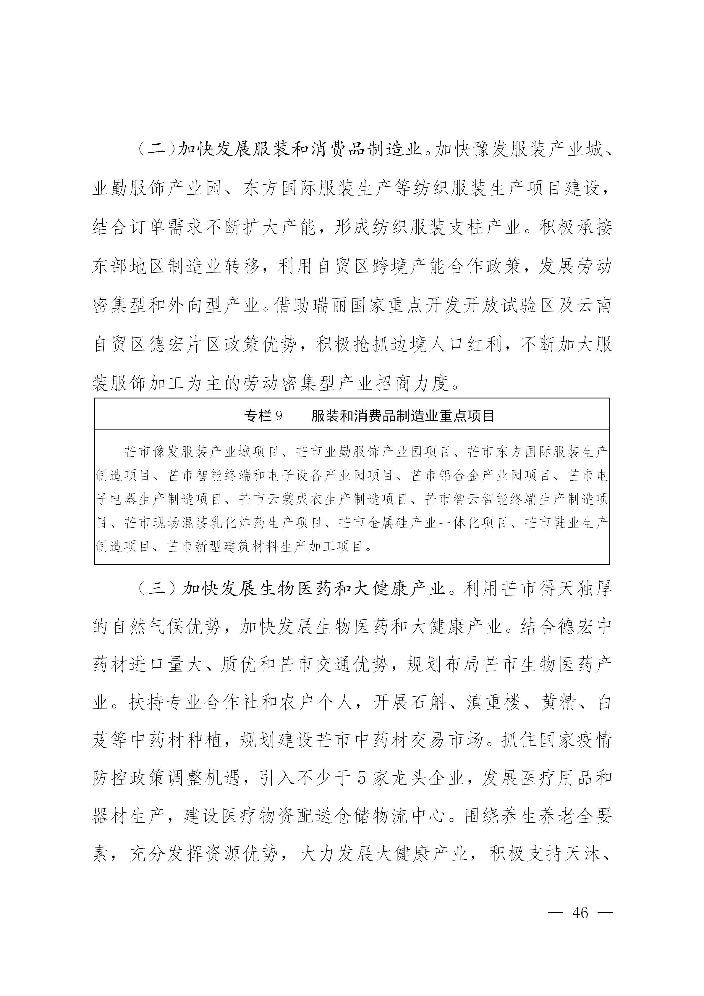 紧紧抓住新时代西部大开发、中国云南自贸区德宏片区、瑞丽国家重点开发开放试验区以及国家“一带一路”、中缅经济走廓建设等重大机遇,立足芒市区位优势、资源优势、比较优势,围绕绿色食品加工、文旅康养、生物医药、纺织服装、电子产品、日用消费品、现代物流等重点产业,不断创新招商引资工作思路、完善招商引资机制、改进招商引资方式、拓宽招商引资领域、落实招商引资责任,积极对接长三角、粤港澳大湾区、京津冀、成渝双城经济圈等发达地区,建立产业转移承接合作机制,吸引更多资本投入芒市。重点突破现代食品加工、电子消费品制造、现代商贸物流、文化旅游、高原特色现代农业、数字经济等产业招商,深入推进精准招商,实现产业集群化、专业化、规模化发展。力争全市产业招商引进到位资金年均增长10%以上,年均引进世界500强、国内500强、民营500强企业2户以上,产业类招商引资项目到位资金占招商引资项目到位资金比重达80%以上。全面实施外商投资准入前国民待遇加负面清单制度,扩大文化、资源、种业、电信等领域向外资开放,积极有效利用外资。