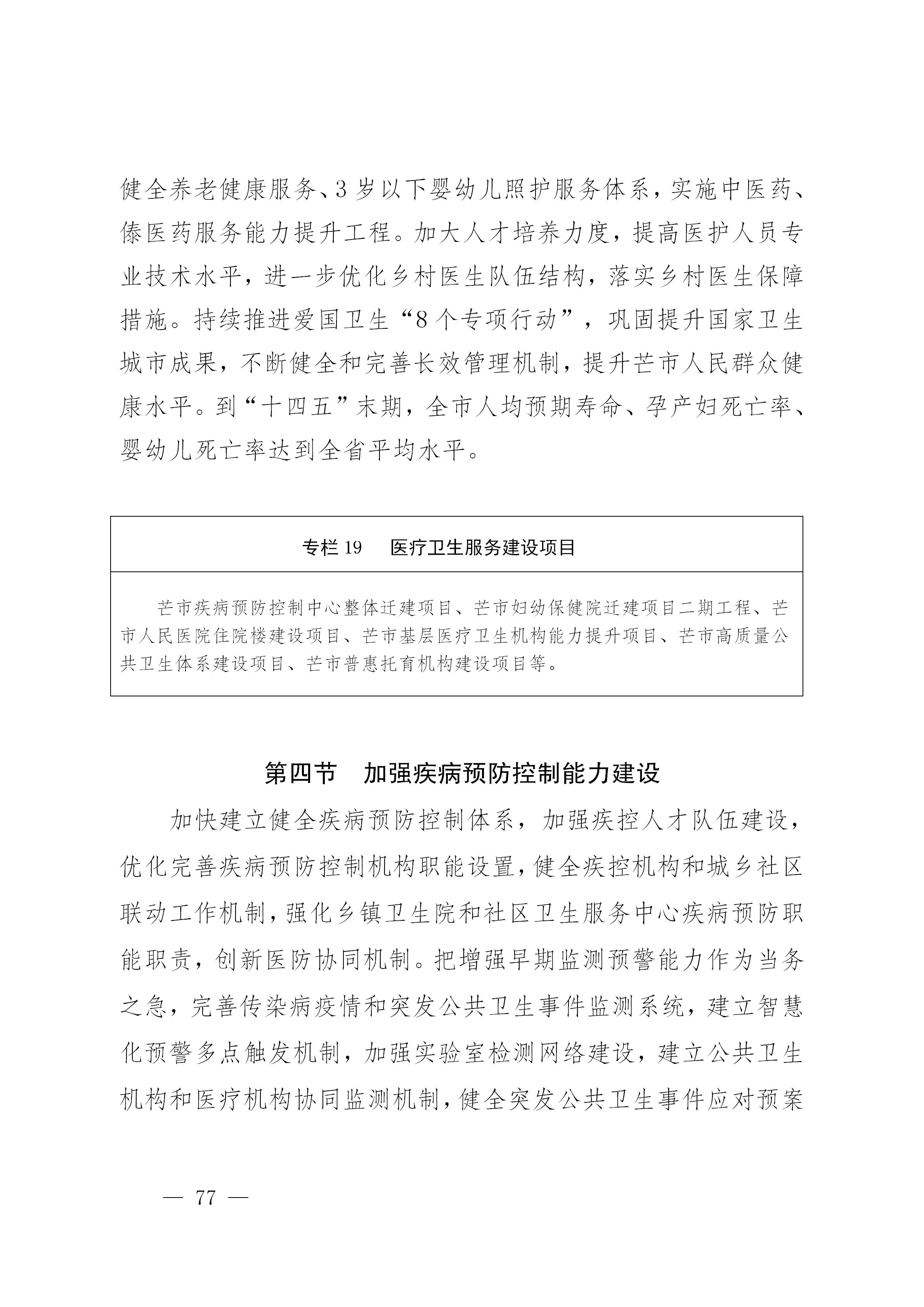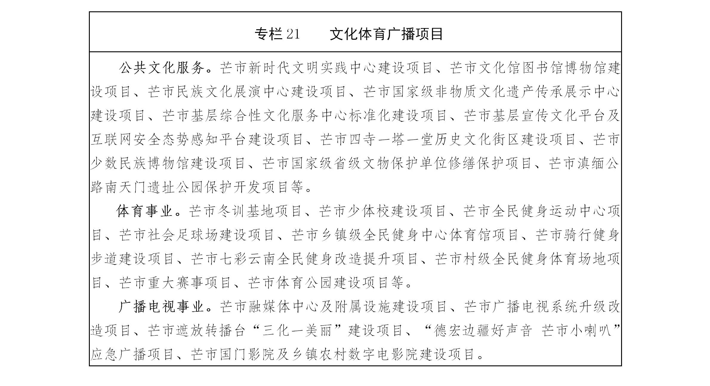 加快构建普惠性、保基本、均等化、可持续的现代公共文化服务体系建设,将文化馆、图书馆、博物馆、乡镇(街道、农场)文化站、社区(村)文化室建设纳入建设规划,建立完善基层综合性文化服务场所,推进基本公共文化服务标准化建设。重点实施芒市文化馆图书馆博物馆建设项目、芒市民族文化展演中心建设项目、芒市国家级非物质文化遗产传承展示中心建设项目、芒市基层综合性文化服务中心标准化建设项目。坚持把社会效益放在首位、社会效益和经济效益相结合,深化文化体制改革,加强文化、体育市场体系建设,加快发展新型文化企业、文化业态、文化消费模式,丰富优质文化产品供给。推进城乡公共文化服务体系一体化建设,创新实施文化惠民、文化艺术精品、国门文化、边疆万里数字文化长廊、“文化云”等工程建设,广泛开展群众性文化活动。大力发展公共文化、新闻出版、广播电视、民语民文等公共文化服务事业。深入推进融媒体建设,实施全媒体传播工程,做强新型主流媒体。重点实施芒市融媒体中心及附属设施建设项目、芒市广播电视系统升级改造项目、芒市国门影院及乡镇农村数字电影院建设项目。