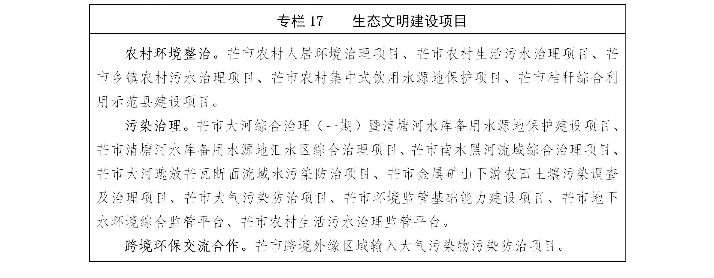 污染防治攻坚战取得重大成果。“十三五”期间,芒市认真贯彻落实“绿水青山就是金山银山”理念,生态环境保护体系更加完善,生态文明建设迈上新台阶。大力推行“一降两禁三治”治理措施,六项空气监测指标大幅改善,2019年空气质量优良率100%,全省排名并列第一。深入推行河湖长制,芒市大河综合治理PPP项目开工建设,勐板河饮用水源地综合治理工程稳步推进,“铁腕清源”行动取得阶段性成效。农村人居环境整治三年行动计划深入实施,芒市生活垃圾焚烧发电项目基本建成,建成乡村生活垃圾热解处理站24座。深入推进“厕所革命”,新建和改扩建城乡厕所4770座。大力开展“散乱污”企业整治,关停取缔和升级改造企业40家。实施增减挂钩项目6个,复垦复绿土地5397.9亩。恢复治理矿山13个227.2亩。编制生物多样性保护实施方案,公益林、天然林保护进一步加强,森林覆盖率达68.87%,菲氏叶猴等珍稀濒危物种保护工作扎实开展。第三次全国土地调查顺利完成,“两江”风景名胜区调规和生态保护红线评估优化工作有序推进,第二次全国污染源普查通过省级核查。