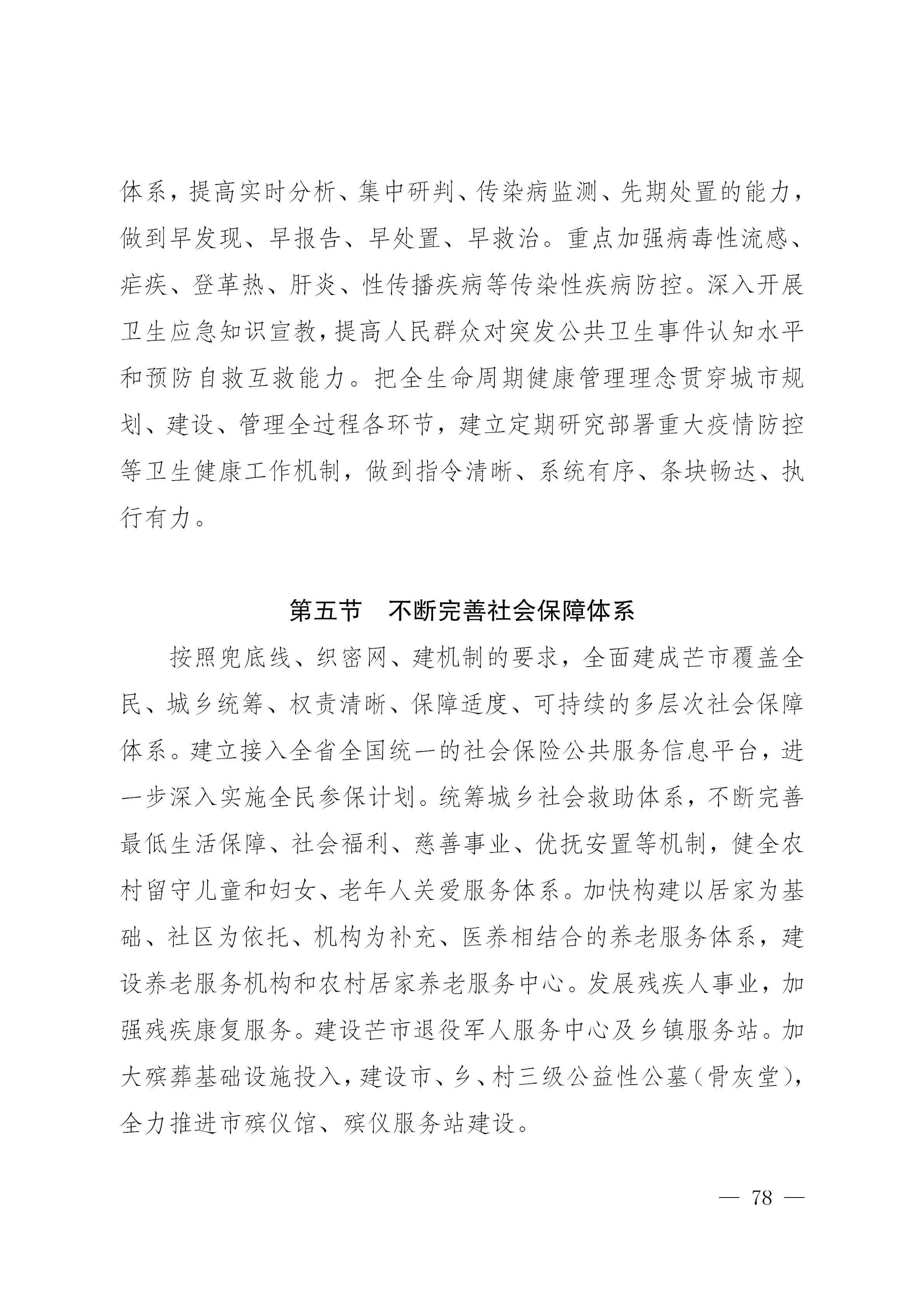 加强社会治理制度建设,完善党委领导、政府负责、民主协商、社会协同、公众参与、法治保障、科技支撑的社会治理体系,提高社会治理社会化、法治化、智能化、专业化水平。正确处理新形势下人民内部矛盾,认真落实新时代“枫桥经验”本地化,畅通和规范群众诉求表达、利益协调、权益保障通道,完善信访制度,健全各类调解联动工作体系,构建源头防控、排查梳理、纠纷化解、应急处置的社会矛盾综合治理机制。加强社会治安防控能力建设,健全用好社会治安巡防体系、公共安全监管体系、应急处置体系,完善重点部位定点武装执勤、屯警街面动中备勤、人员密集场所高峰勤务和联勤武装巡逻“四项机制”和“1分钟”“3分钟”“5分钟”处置封控圈,建好管好用好“雪亮工程”,构建社会治安动态防控新格局。织密筑牢社会治理网络,提升社区网格化、治理精细化和乡村治理水平,推动各类社会组织增强自治能力,推动社会治理重心下移,健全政府治理和社会调节、居民自治良性互动的基层社会治理体系。推进扫黑除恶专项斗争常态化开展,始终保持扫黑除恶高压态势,依法严惩黑恶犯罪活动,深挖彻查“保护伞”。持续提升毒品问题整治能力和治理水平,深入推进第五轮禁毒人民战争。妥善解决社会发展和人民群众生产生活直接相关的矛盾纠纷、治安安全、食品药品安全、环境安全等突出问题。做好预知、预警、预置工作,有效化解重大舆情风险,坚决维护网络意识形态安全。坚持宗教中国化,依法管理宗教,促进宗教和顺。完善国防动员体系,推动平战结合、应急应战一体化建设,加快智慧动员建设。强化全民国防教育,加强拥军优属工作,推进美丽军营建设,巩固军政军民团结,巩固全国双拥模范城创建成果。