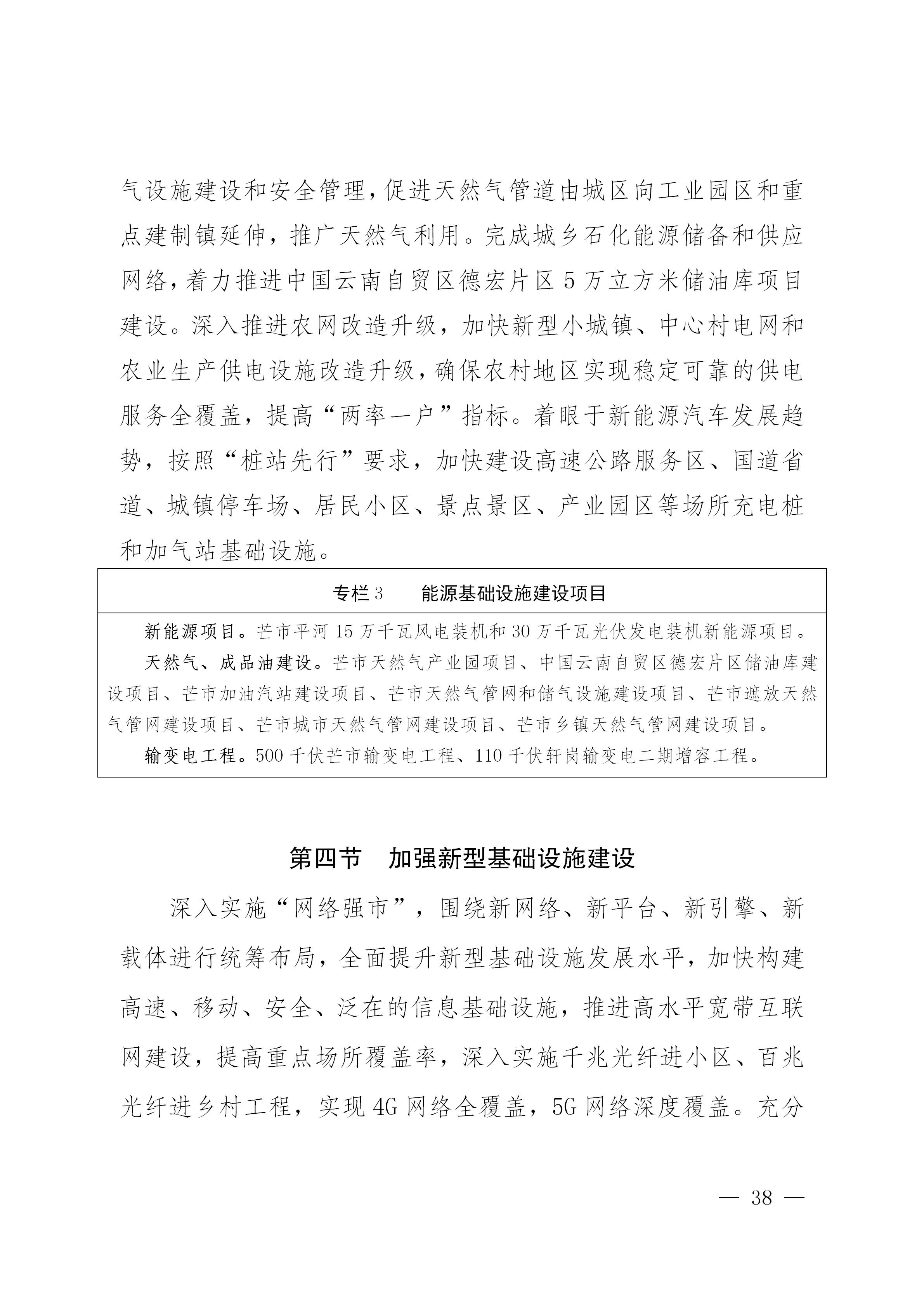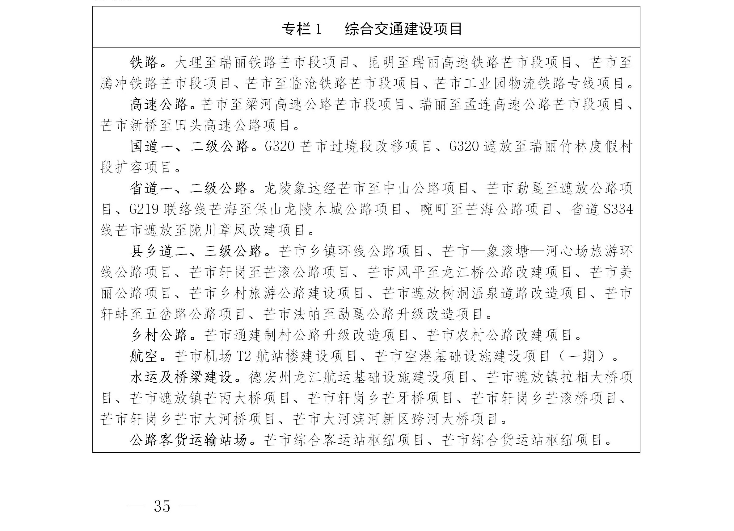 加快推进芒市至梁河、芒市至孟连、芒市新桥至田头三条高速公路项目建设,形成“两横两纵”的高速公路网格局,使芒市对外互联互通更加便捷。完成G320国道芒市过境段改移、G320遮放至瑞丽段扩容、龙陵象达经芒市至中山公路、芒市勐戛至遮放公路、G219芒海至龙陵木城公路、畹町至芒海公路、S334芒市遮放至陇川章凤公路改建等国省干线公路升级改造项目;推进实施芒市乡镇环线公路、芒市—象滚塘—河心场旅游环线公路、芒市轩岗至芒滚公路、芒市风平至龙江桥公路改建、芒市乡村旅游公路、芒市遮放树洞温泉道路改造、芒市轩蚌至五岔路公路、芒市法帕至勐戛公路升级改造等县乡道路建设,加快芒市通建制村公路升级改造、芒市农村公路改建等乡村公路建设,形成便捷通畅高效的国道、省道、县乡道干线公路网格局,主要乡镇、园区和重要旅游景点实现二级及以上公路连通,县乡村公路等级提升到一个新水平。完成芒市公路客运、货运站综合枢纽项目建设,加密公路沿线农村客货运站点,提升芒市客货运承载服务能力。完善农村公路网,新改建一批农村公路,提升农村公路等级和通达深度,实现“四好农村公路”全覆盖,自然村100%通硬化路,建成以连通抵边村寨为主的沿边四级公路环线芒市段。加快推进国省干线公路和农村公路设施美、生态美、路域美建设,打造一批美丽公路。