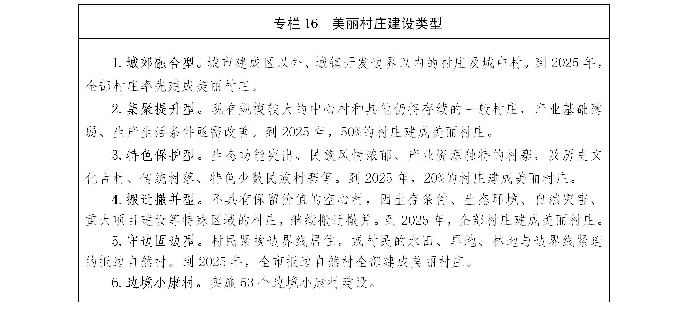 立足全市各乡镇村庄不同的资源禀赋、区位条件、产业基础、民族特色、文化脉络、发展潜力,合理确定村庄发展方向和发展路径,因村施策,分类指导、梯次推进城郊融合型、集聚提升型、特色保护型、搬迁撤并型、守边固边型五类村庄建设。建立健全村庄规划体系,完善乡村公共服务设施,深入实施农村人居环境治理,继续推进农村危房改造和抗震安居工程,加大传统村落、传统民居、历史文化名村、历史建(构)筑物及古树名木保护力度,加快推进边境小康村建设。打造山坝相依、阡陌有序、错落有致、山清水秀、产业厚实、生态宜居的美丽村庄。