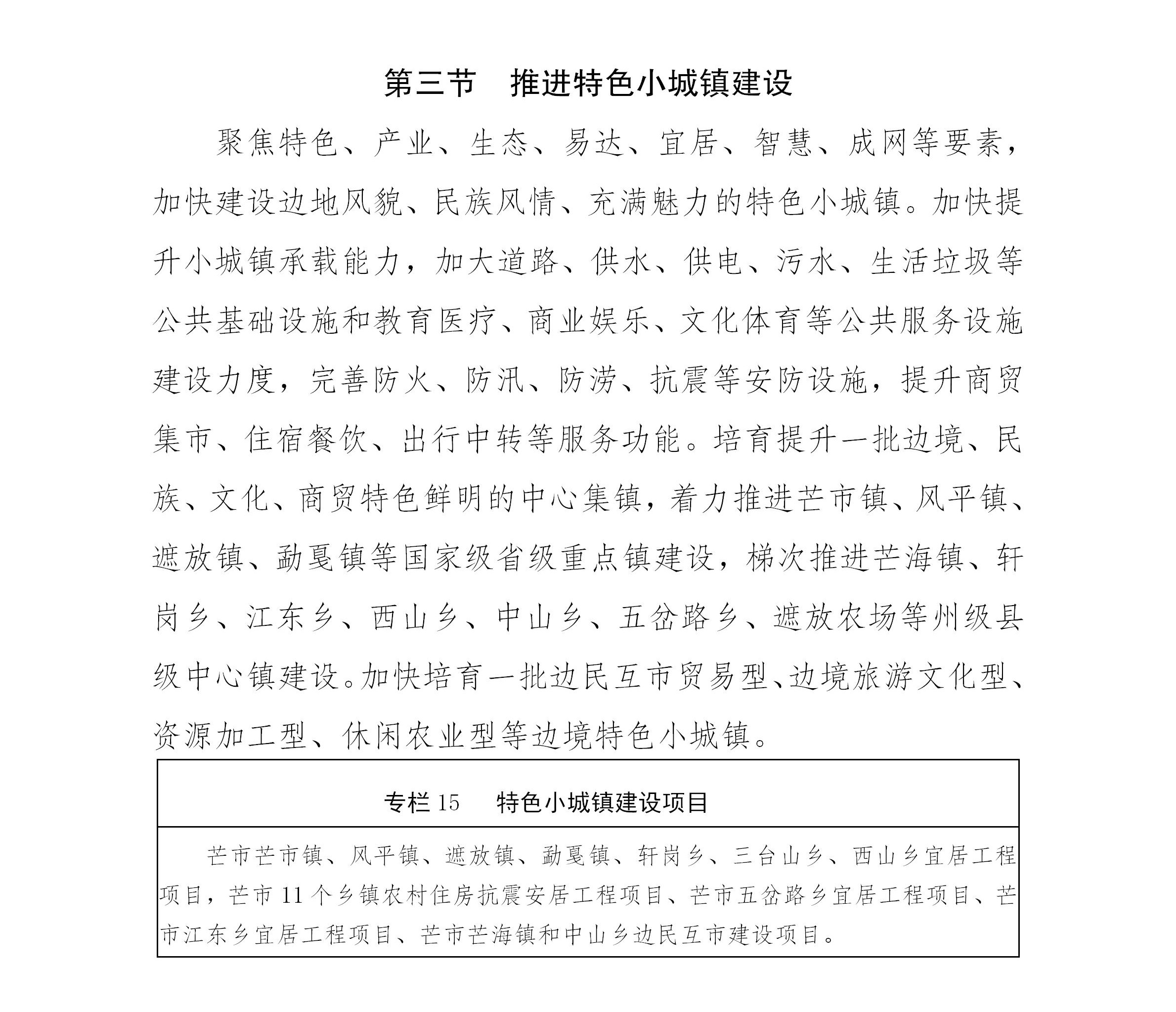 以中部芒市大河经济带、北部特色产业经济带、南部沿边开放经济带为“三带”,坚持发挥优势、因地制宜、突出特色发展产业,推动全市经济社会高质量跨越式发展。中部芒市大河经济带,围绕芒市大河沿岸开发建设,依托龙瑞高速、芒瑞大道、320国道,加快发展旅游文化、生态康养、商贸物流、食品消费品加工等产业,带动芒市大河沿岸勐焕街道、芒市镇、风平镇、三台山乡、遮放镇、遮放农场快速发展,成为全市高质量跨越式发展的主要引擎。北部特色产业经济带,围绕发展壮大高原特色农业和山区经济,加快芒市北部和西部的西山乡、五岔路乡、江东乡、轩岗乡发展,成为全市高质量跨越式发展的重要支撑。南部沿边开放经济带,围绕芒海镇、遮放镇、勐戛镇、中山乡四个边境乡镇,充分发挥边境优势,不断扩大沿边开放,努力提升边贸水平,进一步巩固提升党政军警民合力强边固防成果,打造边境小康示范村和示范乡镇,成为全市高质量跨越式发展的重要补充。