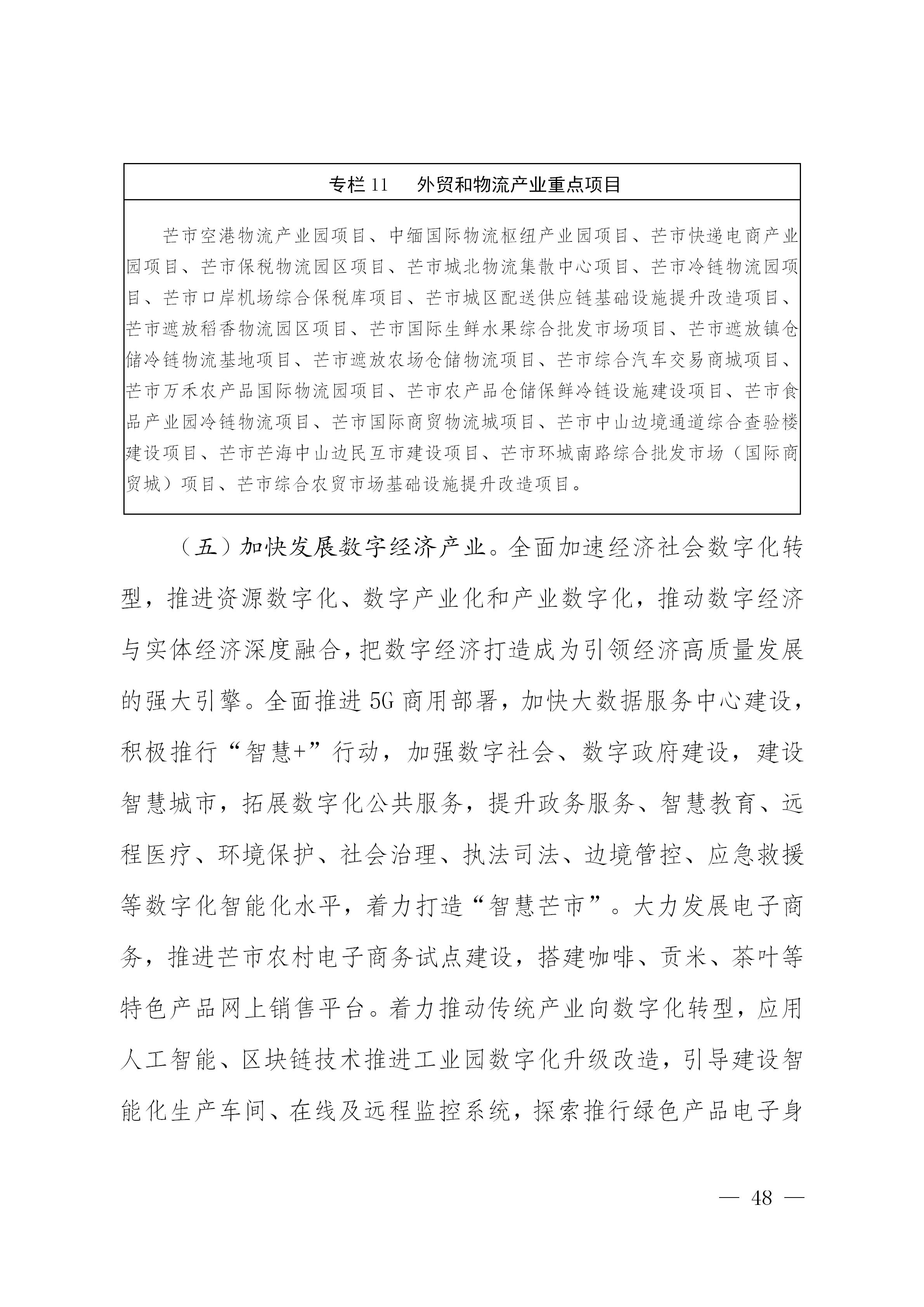 全面提升芒市国际口岸机场建设水平,推进实施芒市国际空港经济区建设项目,开展芒市国际空港经济区产业发展与空间布局规划,重点实施芒市机场T2航站楼建设项目,推进芒市机场国际货运监管场所、边境仓及综合保税仓、进出口货物加工区、航空物流中心等建设。积极开拓芒市直飞缅甸、泰国、新加坡、孟加拉国、印度等东南亚南亚国家重要城市航线,全面拓宽芒市空中国际走廊。新开通和加密芒市直飞国内一二线城、省会城市和重要旅游客源城市的航线,全面畅通空中国内走廊。完善民间传统通道基础设施和监管条件,加快中山边境通道综合查验楼项目建设,完善提升芒海通道配套设施建设,实施芒海边民互市场所建设项目,创新边民通关服务,建设边民就近就便通关绿色通道,进一步改善边民跨境经济交流基础条件,在互联互通、物流仓储、国际贸易、跨境电商、劳务合作等重点领域取得新突破,促进边民稳定致富。