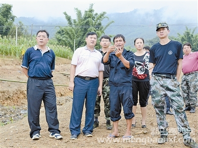 在芒市长沙玉庄的陪同下,孔勒干一行首先来到芒海九年制边境学校,察看了学校球场、围墙、教学楼和学生宿舍的受灾情况。在学校被泥石流淹没的篮球场旁,学校老师和附近寨子里的群众自发来到这里疏通沟渠,大家手持锄头和簸箕干得热火朝天,就连满头白发的老大妈也加入到了救灾队伍中来。孔勒干与大家亲切交谈,并向他们表达了崇高的敬意和深切的慰问。沿着球场边的南碧河,孔勒干一行察看了河水改道的情况,孔勒干说:“要切实抓好河水改道治理工作,确保河水不再威胁到学校的安全。”随后,孔勒干一行来到吕尹村委会户娜村民小组察看了村民的受灾情况和搬迁点的选址情况,并深入农户看望了部分受灾群众。最后,孔勒干又来到吕尹村安置点察看了群众的生活状况,并鼓励大家要树立信心,争取早日重建家园。