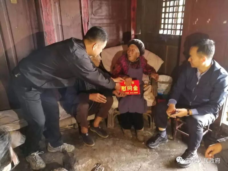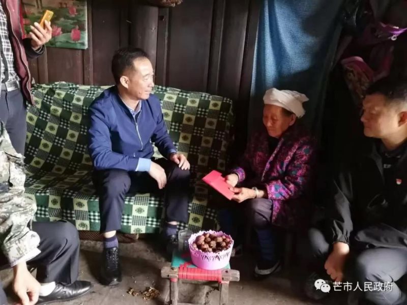 毛市长一行先后走访慰问了江东乡花拉厂村五家寨二组杨顺娣、李子坪村空竹林三组刘重换两位老人。“祝您节日快乐,健康长寿,家庭幸福!”每到一处,毛市长都与老人亲切交谈,嘘寒问暖,市委、市政府向他们致以节日问候,并送上慰问金和慰问品。