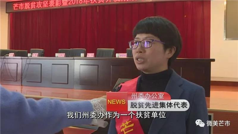 脱贫先进集体代表,州委办公室工作人员说:“我代表州委办公室集体来领这个奖,我觉得很荣幸。首先要感谢社会各界对脱贫工作的关心和支持,脱贫攻坚工作永远在路上,我们州委办作为一个扶贫单位,我相信在以后的工作中,脱贫的力度也不会减,(我们将)会派出精兵强将继续抓好这项工作”。