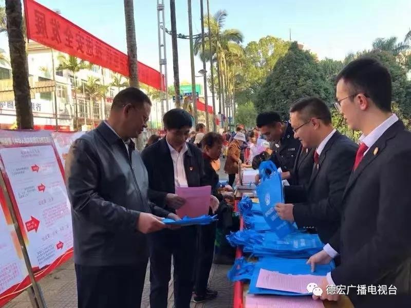 来自州和芒市司法局、法院、检察院、安监委等普法成员单位的工作人员在芒市街心花园通过摆摊设点的方式,对习近平新时代中国特色社会主义思想和党的十九大精神;新修定的《中华人民共和国宪法》;《中华人民共和国监察法》和党内法规;国家安全方面法律法规;扫黑除恶方面法律法规;防范金融风险方面法律法规;禁毒防艾法律法规;各单位依法履行职责的部门法律法规;与人民群众生活生产密切相关的法律法规进行了宣传。期间共发放宣传资料35000余份,展出展板110块。
