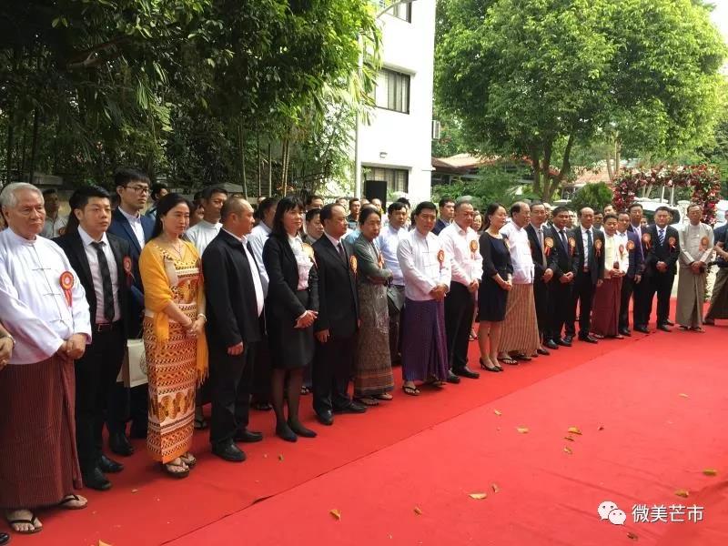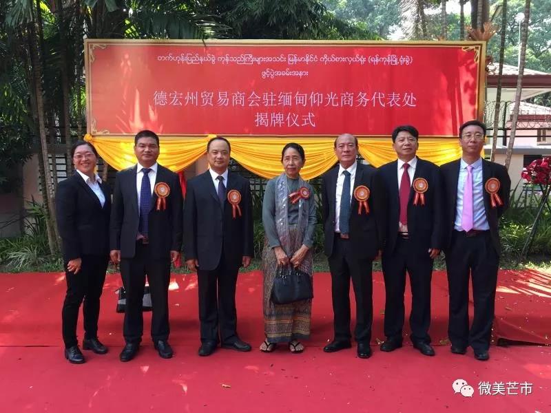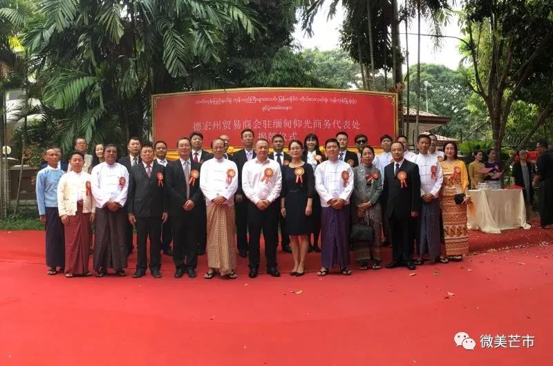为深入推进德宏与缅甸仰光在商务、旅游、文化、科技、产业的宽领域纵深合作,以开放、包容、多元的合作理念推进区域经济发展,2018年12月20日上午10时,云南省德宏州贸易商会在缅甸仰光隆重举行驻仰光商务代表处揭牌仪式。中华人民共和国驻缅甸大使馆公使衔参赞李小艳,德宏州委常委、副州长张辉,芒市委副书记李二喊过,芒市人大常委会副主任杨黎蓉,芒市人民政府副市长祁叶弄,芒市政协副主席曹发成,缅甸工商联合协会主席吴佐明温,缅中友好协会中央荣誉主席吴盛温昂,缅甸原商务部副部长彭山博士,缅甸前总理吴努女儿佐丹丹努女士,仰光省云南会馆会长张迎春,仰光地区商会协会代表、企业代表、民间友好人士共200余人出席了揭牌仪式。李小艳公参、吴盛温昂主席、彭山博士,张辉副州长,佐丹丹努女士,张迎春会长共同为德宏州贸易商会驻缅甸仰光商务代表处揭牌。