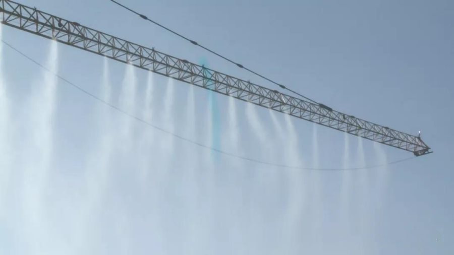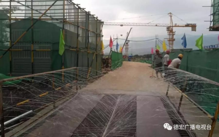 此外,在人工洒水降尘的基础上,芒市住建局结合雾炮机、脚手架喷淋等新手段,施工扬尘治理成效明显;针对长期停工、无人管理的世贸广场项目,在建筑主体上安装喷淋系统,进行施工现场降尘防尘处理。