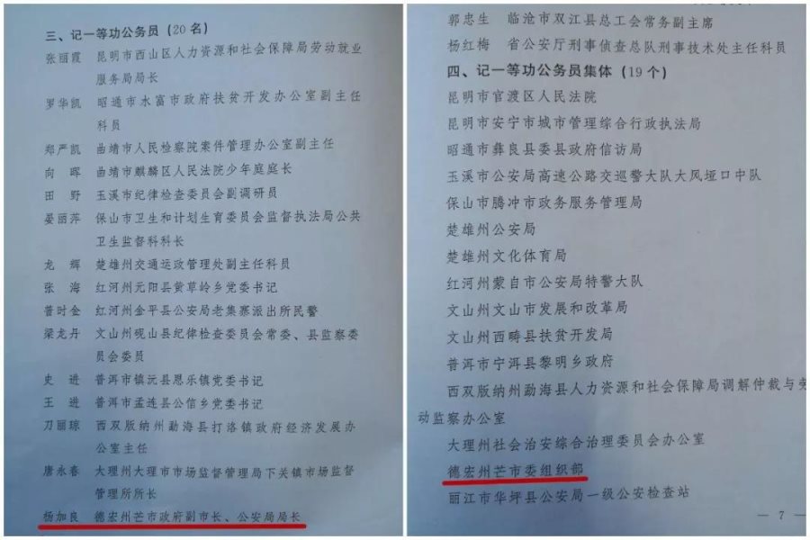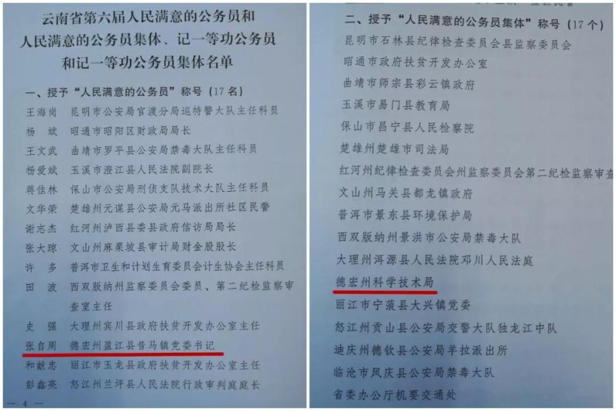 其中,德宏州科学技术局被授予“人民满意的公务员集体”称号;芒市委组织部记一等功;盈江县昔马镇党委书记张自周被授予“人民满意的公务员”称号;芒市政府副市长、公安局局长记一等功。