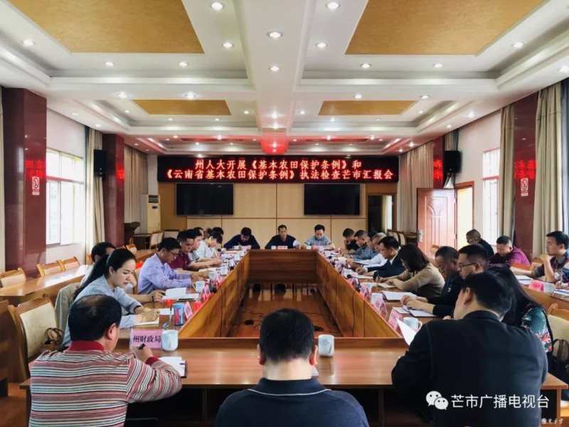 在下午召开的汇报会上, 芒市人民政府党组成员杨恩龙汇报了芒市贯彻实施《基本农田保护条例》和《云南省基本农田保护条例》情况。