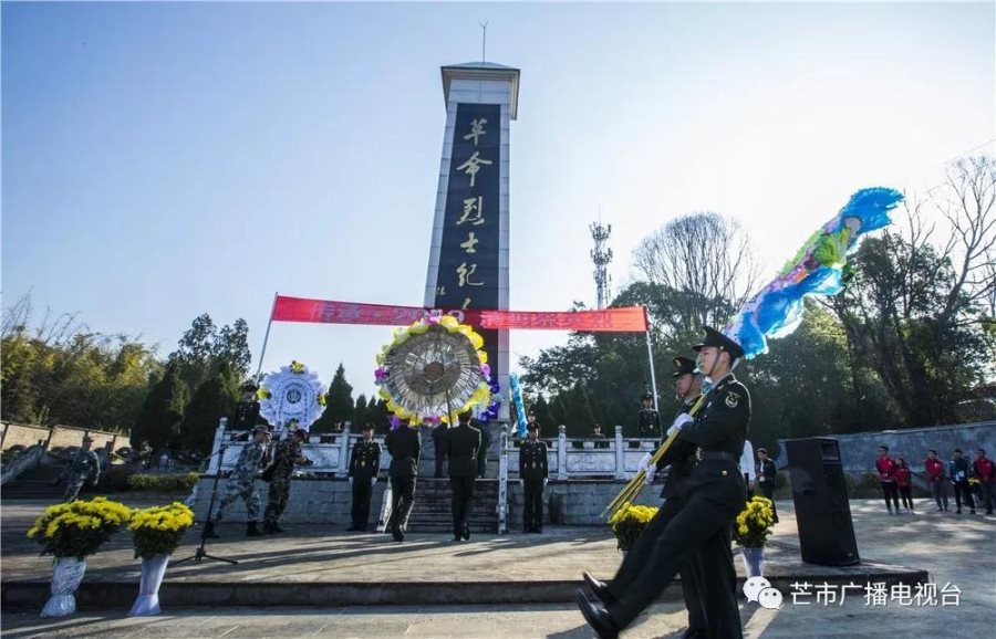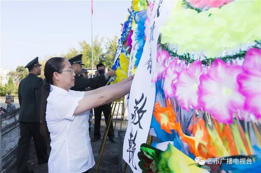 在芒市烈士陵园,全体人员向烈士默哀。伴着《献花曲》激昂深情的旋律,献花礼兵迈着整齐的步伐,抬起由德宏军分区、中国人民解放军31643部队、武警德宏支队、中共芒市委、芒市人大常委会、芒市人民政府、芒市政协等单位敬献的花圈缓步前进,将花圈整齐排列放在纪念碑前。敬献花圈单位领导为烈士整理花圈挽联,缅怀先烈。