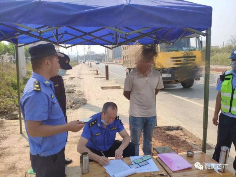4月6日起,芒市城市管理综合行政执法局会同芒市公安局交警大队在城区主要道路路口设置检查点,对运载砂石、渣土、粉尘物等物品的车辆逐一检查,并对运输车辆不按规定办理《入城证》和车辆运载散装货物不做密闭覆盖、沿途抛撒的违法行为依法给予行政处罚,加大工程施工运输扬尘污染防治,保障人民群众身心健康。