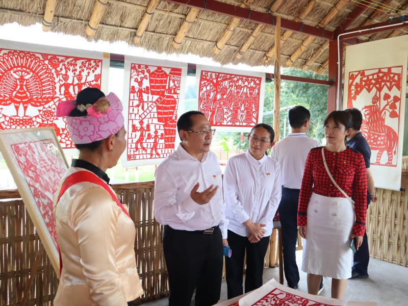 宣讲结束后,杨昆与村民们就发展乡村旅游,在产业发展上要怎么做、乡村振兴战略将给村民带来哪些实惠等主题做了交流。宣讲团一行还参观了介桃的景点风采,观看了国家级非物质文化傣族剪纸,傣族果雕技术,傣族手工织布等民族技艺,对介桃村在党支部的“一巷一线一社一阵地”的引领下,以“党建+产业”为先导发展乡村旅游铺就致富路表示肯定和赞许。