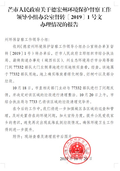 芒市人民政府关于德宏州环境保护督察工作领导小组办公室督转〔2019〕1号文办理情况的报告(补公开)