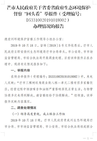 芒市人民政府关于省委省政府生态环境保护督察“回头看”举报件(受理编号:D53310020191018001)办理情况的报告(补公开)
