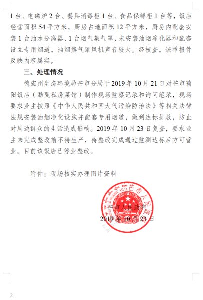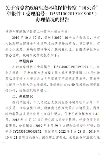 芒市人民政府关于省委省政府生态环境保护督察“回头看”举报件(受理编号:D53310020191020001)办理情况的报告(补公开)