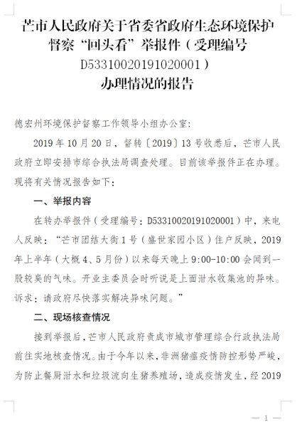 芒市人民政府关于省委省政府生态环境保护督察“回头看”举报件(受理编号:D53310020191020001)办理情况的报告(补公开)
