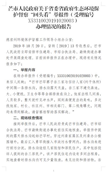 芒市人民政府关于省委省政府生态环境保护督察“回头看”举报件(受理编号:D53310020191020001)办理情况的报告(补公开)
