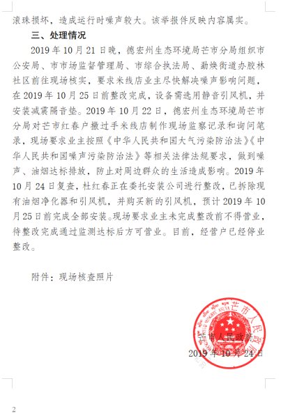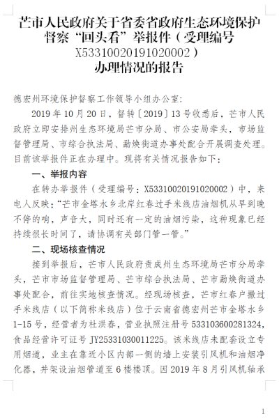 芒市人民政府关于省委省政府生态环境保护督察“回头看”举报件(受理编号:X53310020191020001)办理情况的报告(补公开)