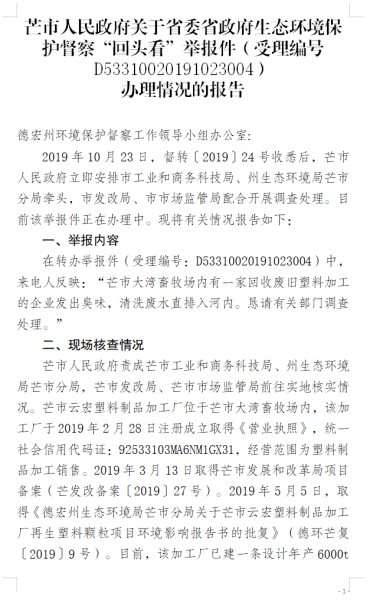 芒市人民政府关于省委省政府生态环境保护督察“回头看”举报件(受理编号:D53310020191023004)办理情况的报告(补公开)