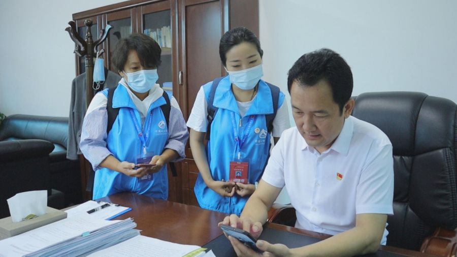 普查员走入谢金翔办公室,就民族、户口登记地、文化程度、住房情况等普查内容进行了详细询问,谢市长逐一认真回答普查员询问,并在普查员的指导下使用人口普查数据采集系统提交了普查信息。登记结束后,谢金翔做了简要讲话。