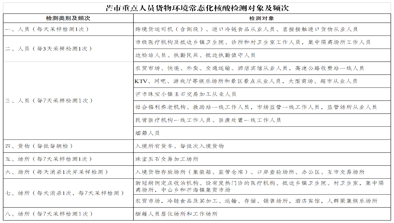 附件:芒市重点人员货物环境常态化核酸检测对象及频次(点击可下载)