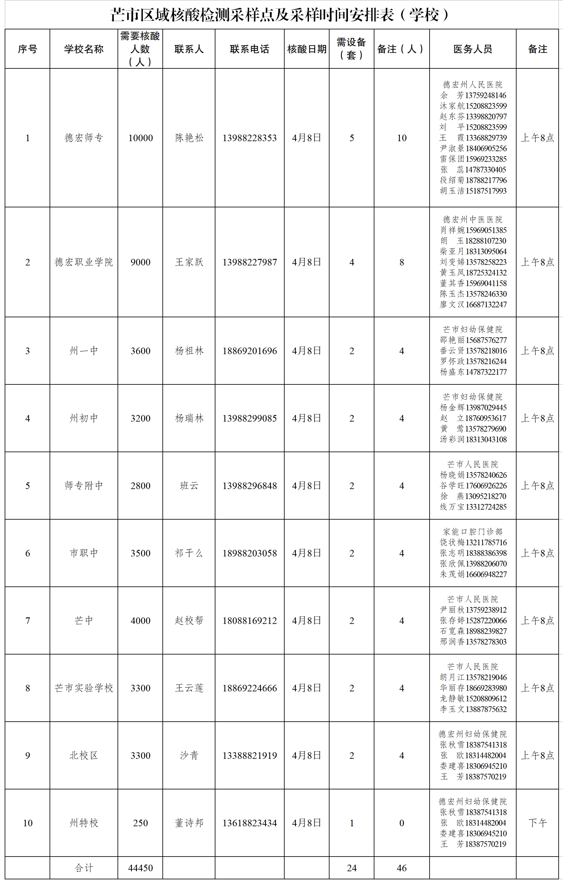 (一)德宏师范高等专科学校、德宏职业学院、德宏州民族第一中学、德宏州民族初级中学南校区、德宏州民族实验中学、芒市第一中学、芒市职业教育中心、芒市实验学校、德宏州民族初级中学北校区、德宏州特殊教育学校、芒市城郊中学11所学校师生于2022年4月8日统一在学校内采样,其他学校师生在居住地网格设置的采样点采样。