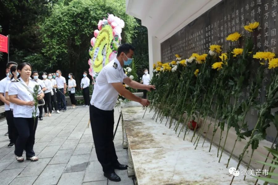 庄严肃穆的纪念碑高高耸立。全体人员伫立碑前,默哀,绕纪念碑一周,瞻仰纪念碑,向烈士敬献菊花,缅怀先烈,追忆英雄足迹。