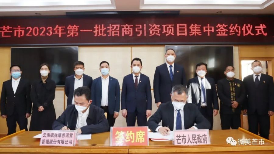 1月4日,市委三届四次全会闭幕后,芒市紧接着举行2023年第一批招商引资项目集中签约仪式,芒市锦绣阳光家园·户育小区康养项目,芒市年产2万套件PVC塑料管材系列产品生产线项目,芒市农垦文旅城项目,芒市5万吨谷物深加工项目,芒市乐禾食品供应链基地项目等5个项目顺利签约,合作金额共计38.7亿元,包含文化旅游和大健康产业、特色农业、绿色食品加工产业及制造业。