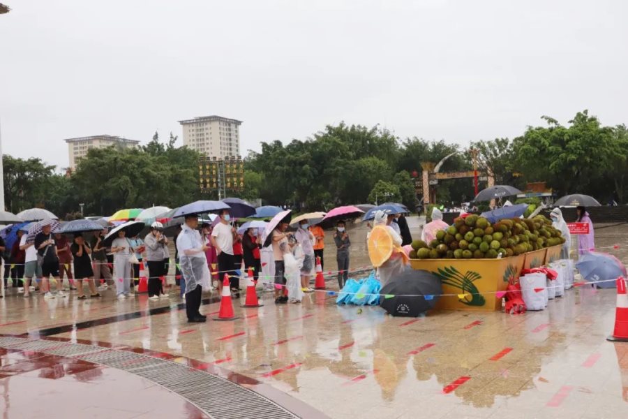 市民和游客早早地来到广场,不一会儿就排成了井然有序的长龙,虽然天空下着雨,但并不影响大家参与活动的热情。