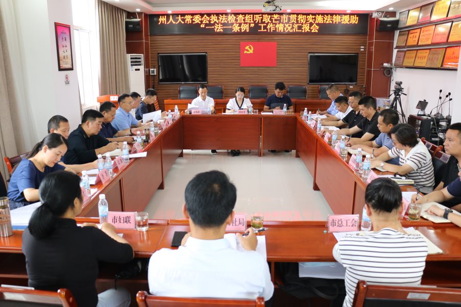 在执法检查汇报会上,检查组听取了芒市人民政府副市长、市公安局局长唐健关于贯彻实施“一法一条例”情况汇报。“一法一条例”实施以来,芒市人民政府高度重视,强化学习宣传,法律援助意识显著增强;加强队伍建设,法律援助能力不断提升;拓宽工作渠道,法律援助工作高效运行;坚持部门联动,法律援助工作形成合力。市公安局、市检察院、市法院和市人社局等部门结合职能就贯彻落实情况、工作存在困难以及下一步工作的措施分别进行了补充汇报。执法检查组对芒市贯彻实施“一法一条例”工作给予了充分肯定,并就我市法律援助工作提出意见和建议。