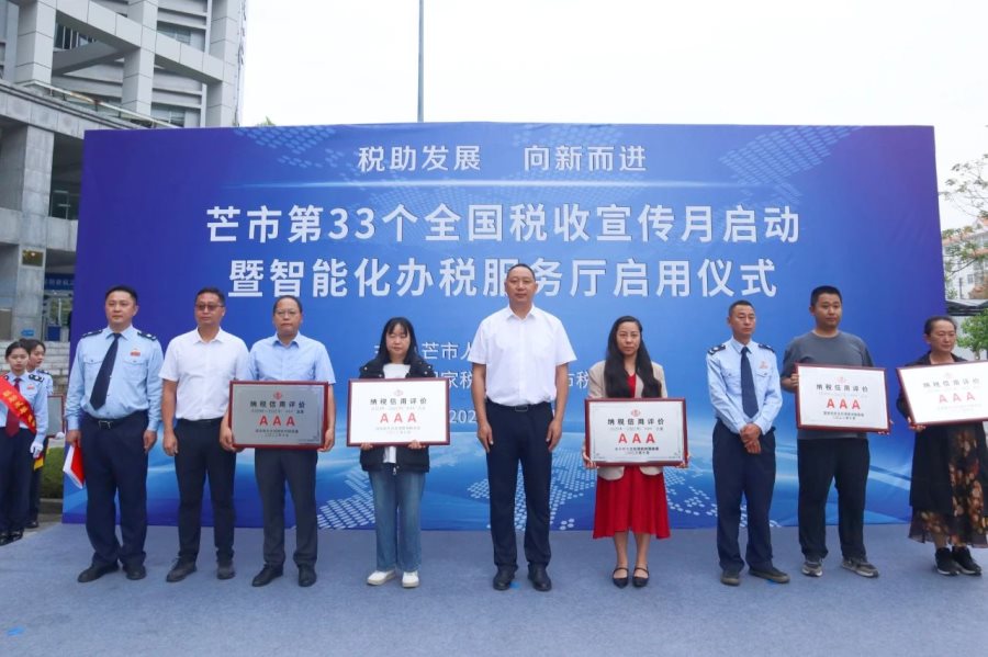 4月1日,芒市举行第33个全国税收宣传月启动暨智能化办税服务厅启用仪式。市委副书记、市长郑昭,德宏州税务局党委委员、副局长杨金,市委常委、市政府常务副市长蒋自成出席仪式。