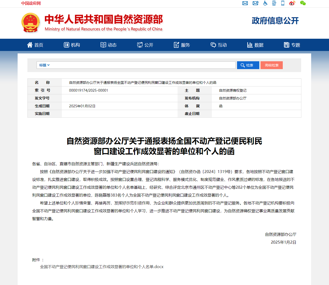 按照《自然资源部办公厅关于进一步加强不动产登记便民利民窗口建设的通知》(自然资办函〔2024〕1319号)要求,各地按照不动产登记窗口建设标准,扎实推进窗口建设,取得积极成效。按照窗口设置合理、登记流程科学、服务模式优化、制度规范健全、作风素质过硬的标准,在各地报送的不动产登记便民利民窗口建设工作成效显著的单位和个人名单基础上,经研究,综合评定北京市通州区不动产登记中心等282个单位为全国不动产登记便民利民窗口建设工作成效显著的单位,陈晓磊等383名个人为全国不动产登记便民利民窗口建设工作成效显著的个人。