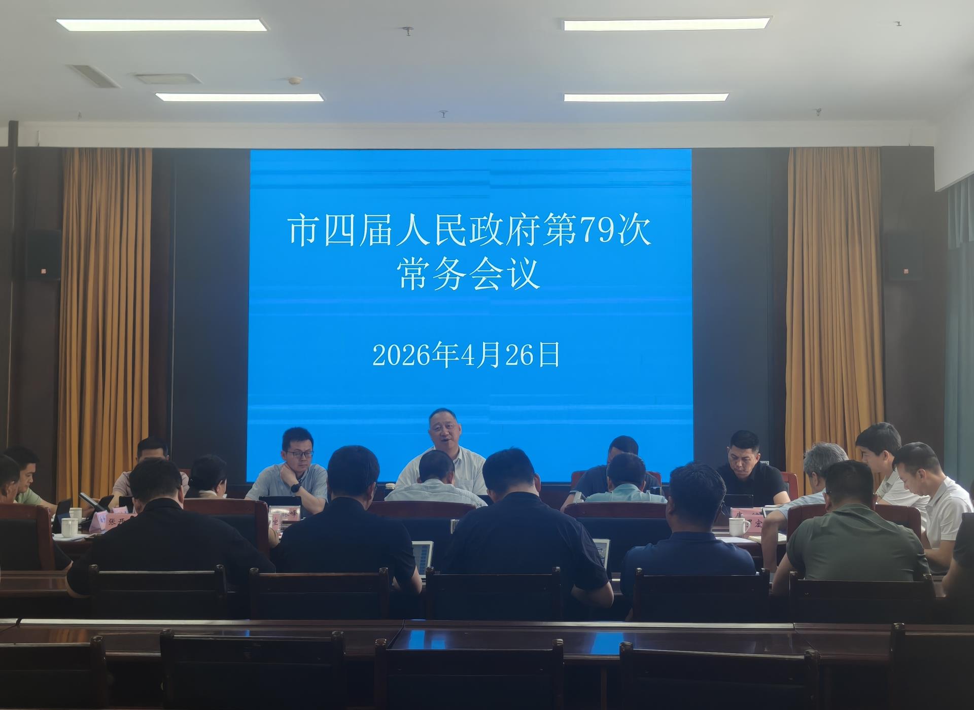2026年4月26日,市人民政府市长郑昭在市委党校一楼会议室主持召开市四届人民政府第79次常务会议,传达学习习近平总书记近期重要讲话、重要指示精神。