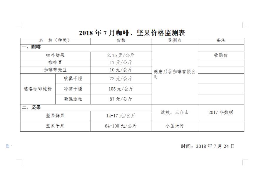 2018年7月咖啡、坚果价格监测表