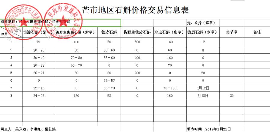 芒市地区2019年1月份石斛价格