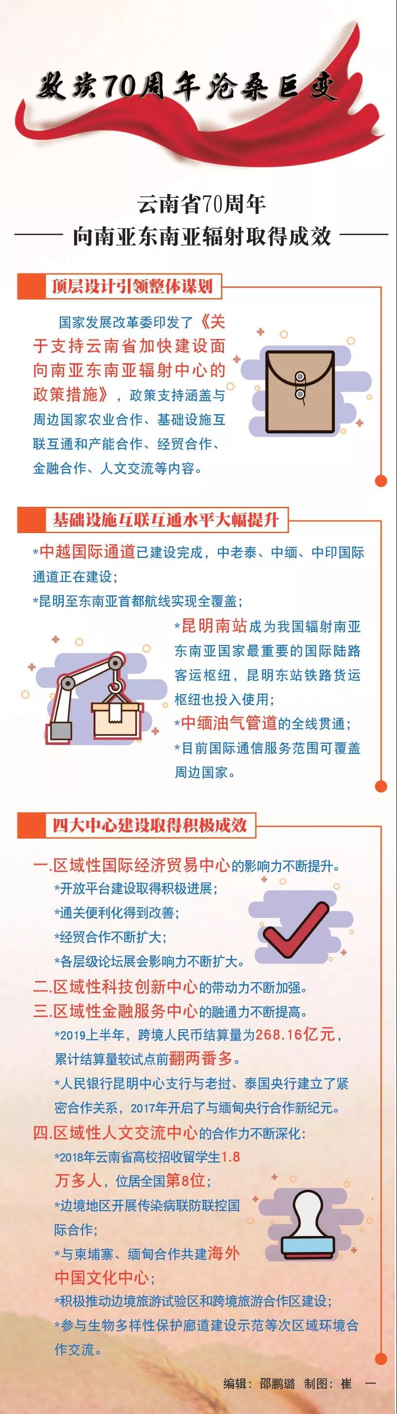 今年是中华人民共和国成立70周年,70年披荆斩棘,70年风雨兼程。特别是改革开放40年来,云南省在党中央、国务院和历届省委、省政府的正确领导下,各族人民筚路蓝缕,砥砺奋进,经济社会快速发展,百姓安居乐业,边疆团结稳定。云南省在加快推进面向南亚东南亚辐射中心建设中,取得了积极成效。