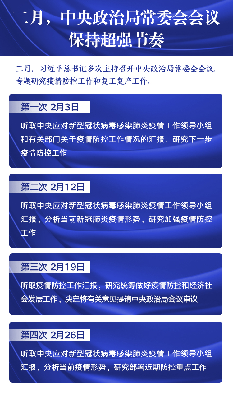 2月19日,习近平主持召开中央政治局常委会会议,研究统筹做好疫情防控和经济社会发展工作,决定将有关意见提请中央政治局会议审议。